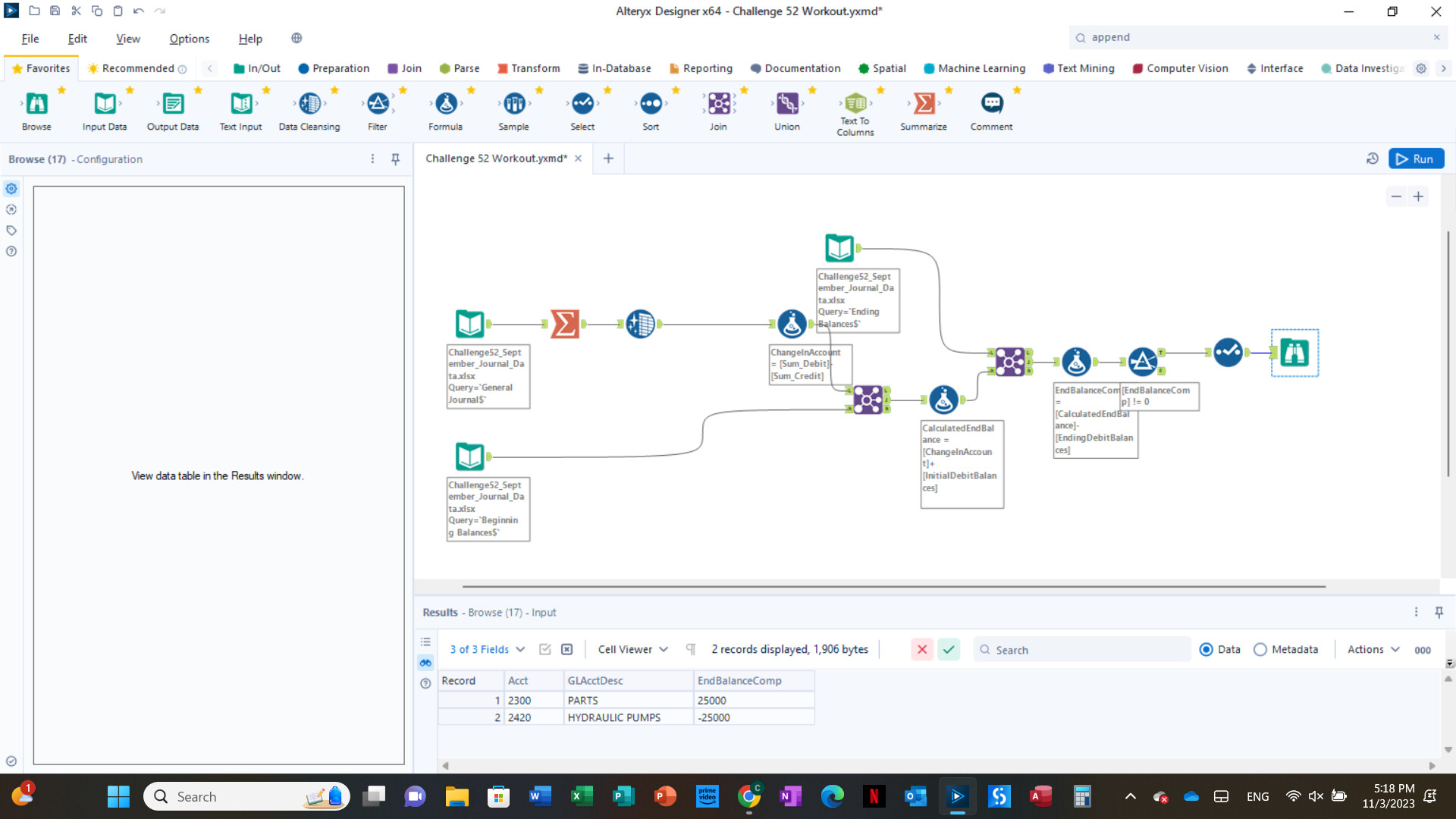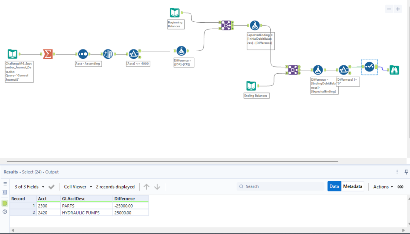 This was a great challenge. I wonder if the Parts and Hydraulic Pumps accounts got switched during some transaction. For some reason, my filter on the difference didn’t work without me rounding the calculated and given ending balances. An issue I ran into was most of my tools were adding a null account row at the top of the data. By the end I had like 6 haha! I know I can use the data cleansing tool to remove them, but I wonder if anyone has a suggestion on how to prevent it.